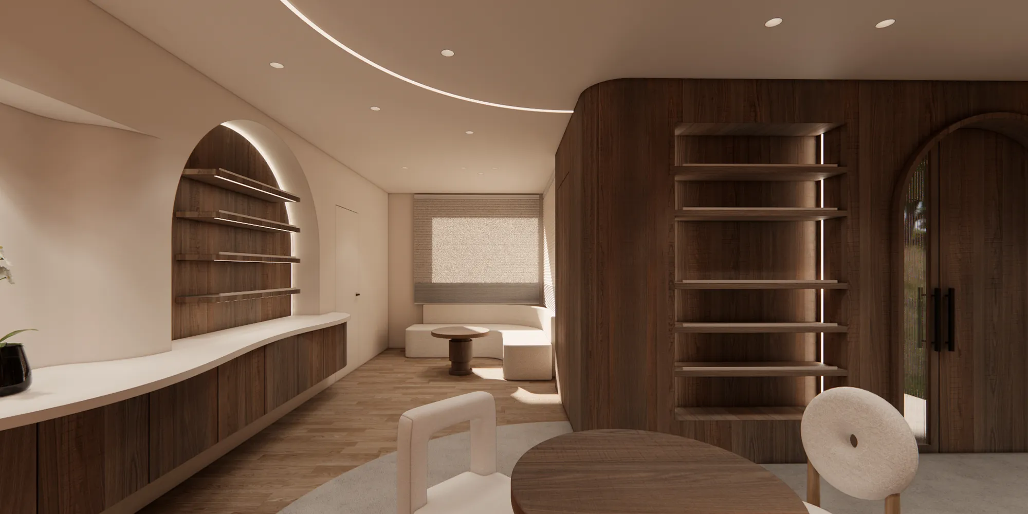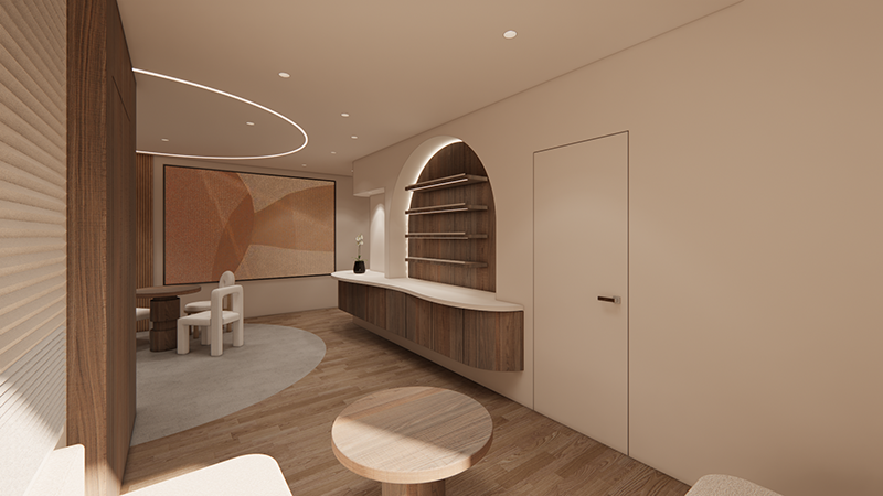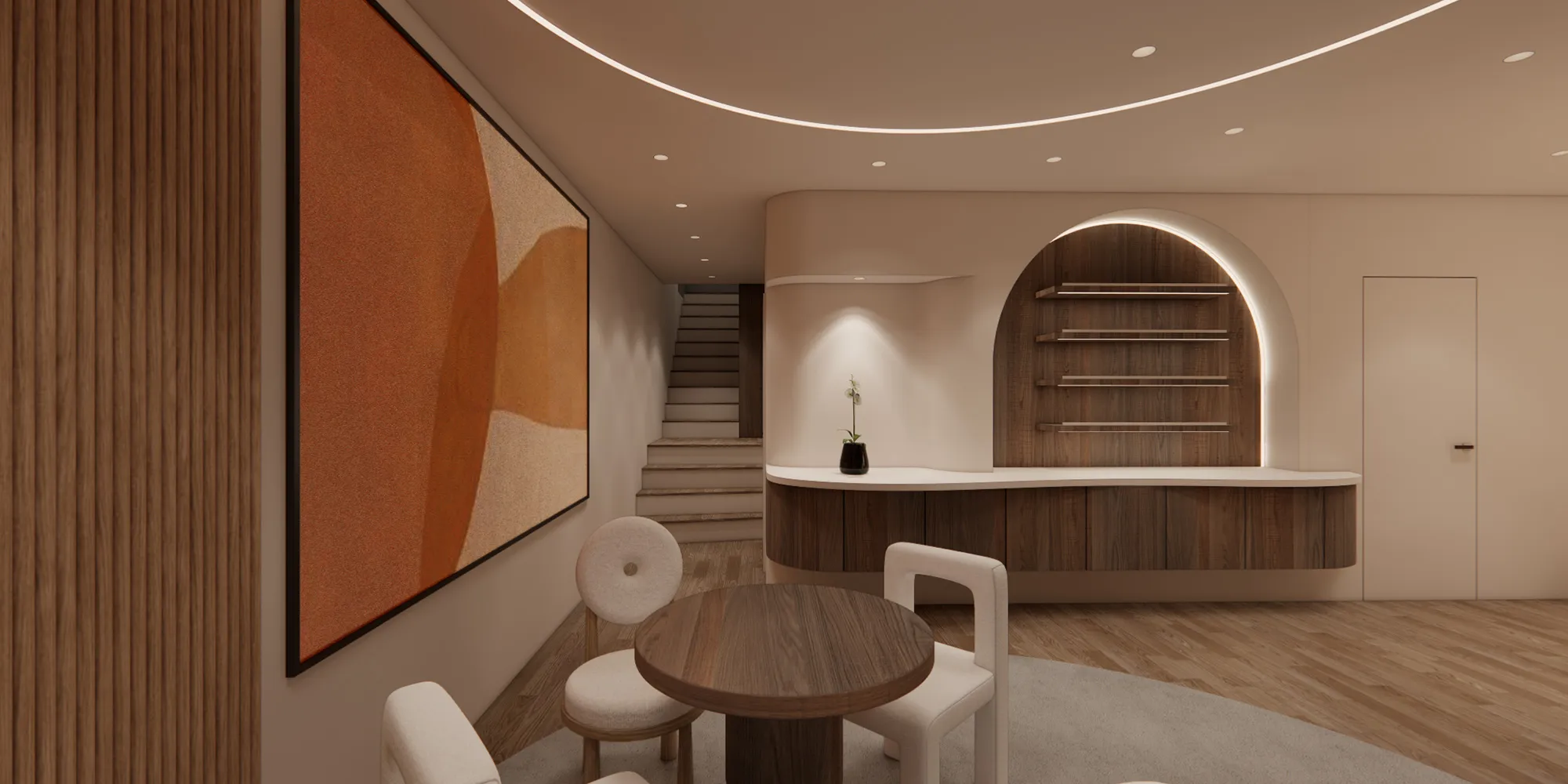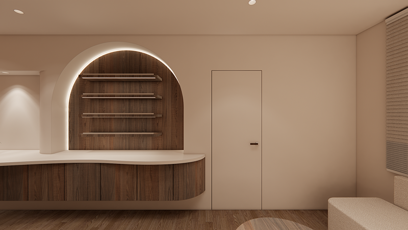 弧形線條、溫暖燈光與自然材質的搭配,