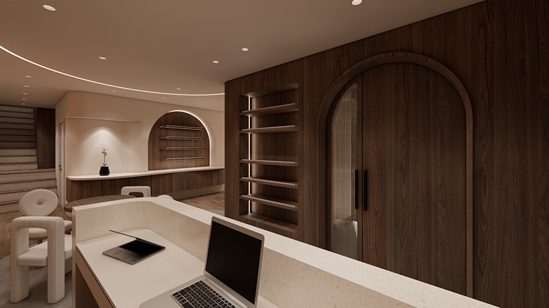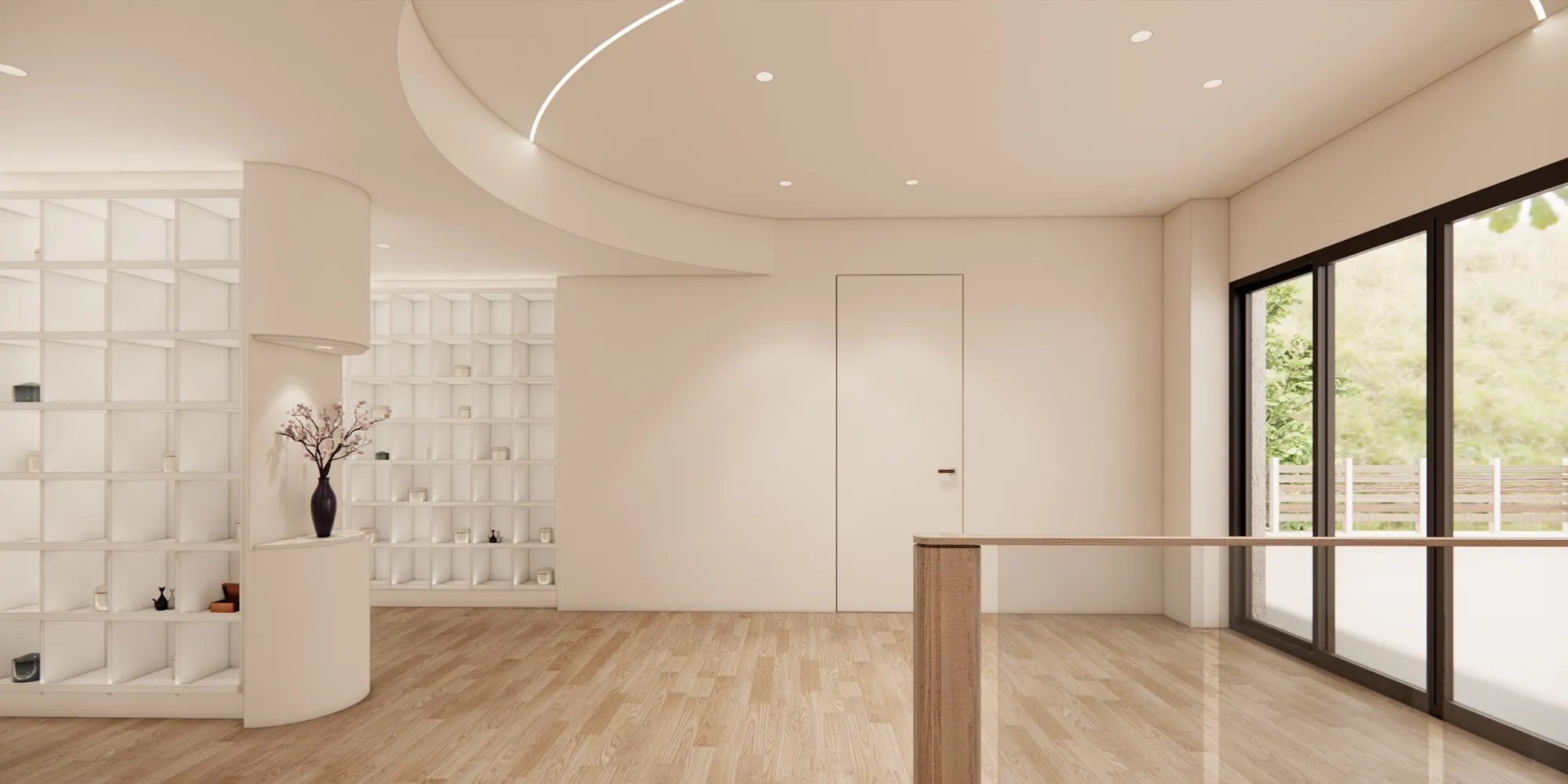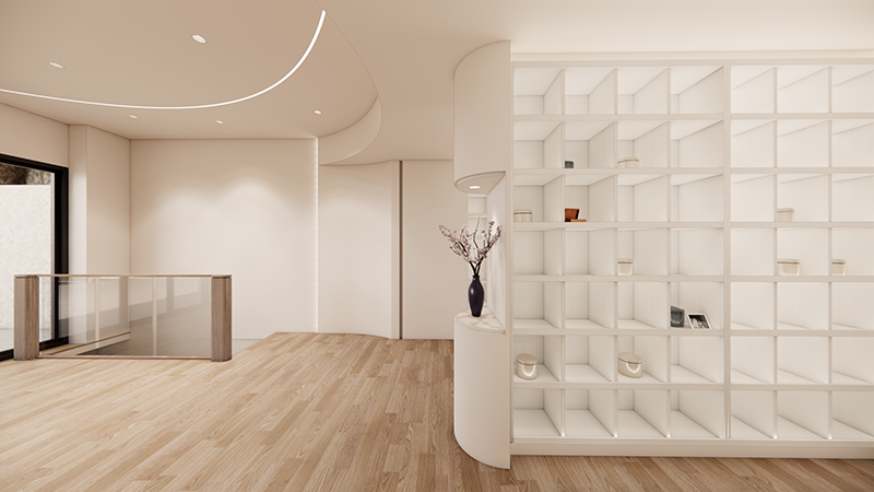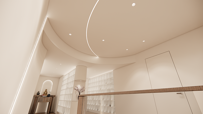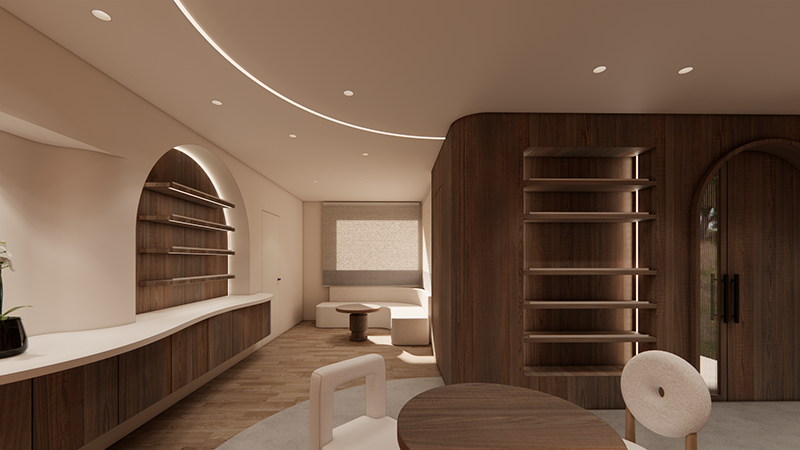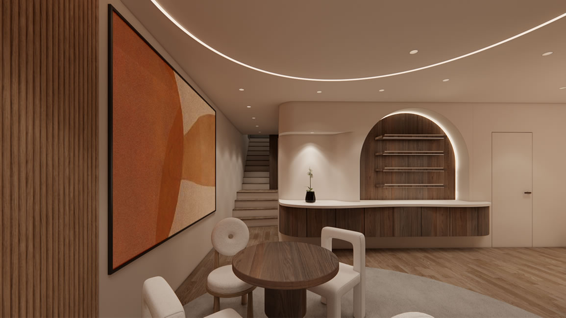 弧形線條、溫暖燈光與自然材質的搭配,